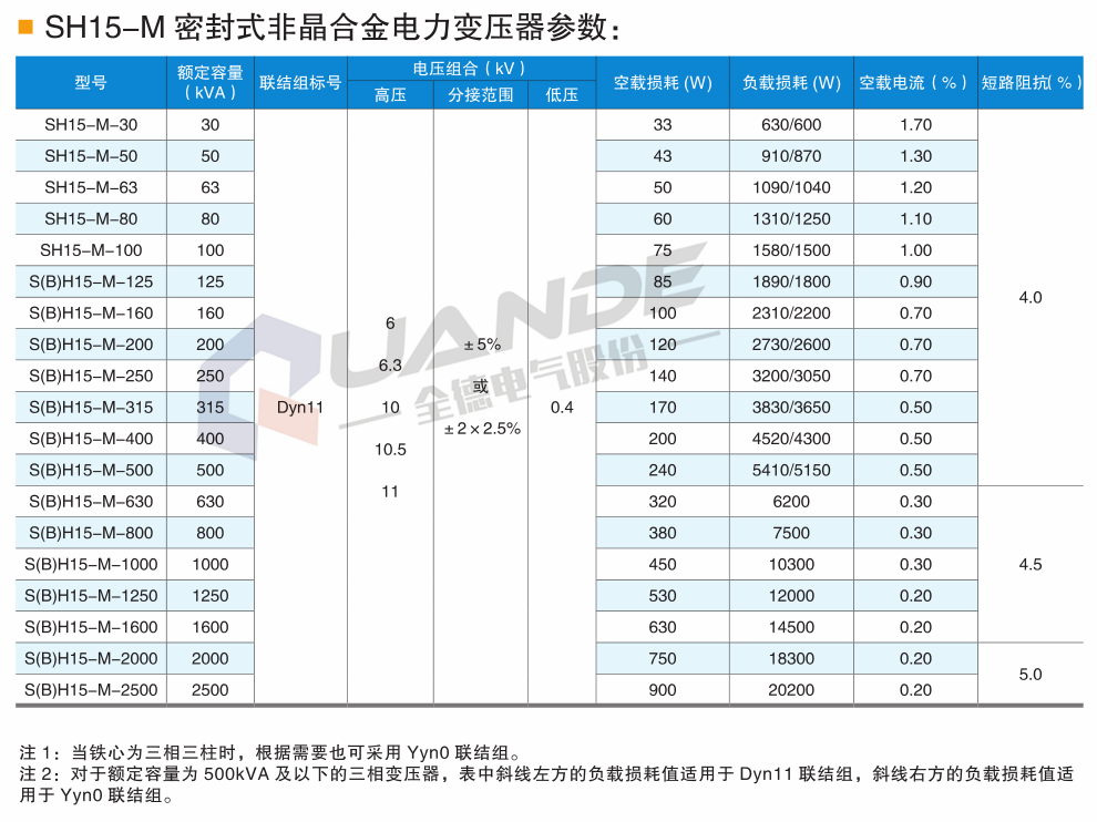 SH15-M-30~2500/6~10系產品負載損耗在GB/T6451標準值基礎上下降15%,空載損耗在GB/T6541標準值基礎上下降70%。執行標準JB/T10318-2002《油浸式非晶合金鐵心配電變壓器技術參數》。